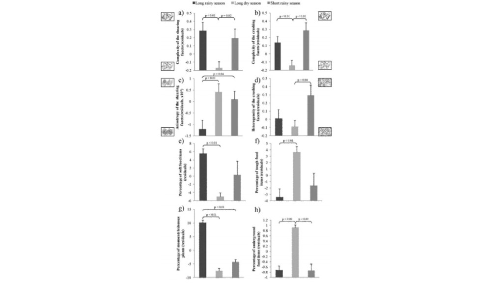 The study concluded that the feeding selectivity depended on the availability of resources, and that these resources depended on humidity, sunshine intensity, altitude or soil composition (Percher et al. 2017). Mandrills were observed to feed on significantly more soft food items compared to tough fibrous food items in the long rainy season, compared to the long dry reason – which is reflected in the complexity of shearing facets, which were noted to be more complex during the long rainy season compared to the long dry season where anisotropy is highest and complexity was at its lowest observed rates (Percher et al. 2017). Figure 1a illustrates the relationship between seasonality on the Mandrill’s diet using DMTA parameters (Percher et al. 2017). This observation may be due to the high presence of monocotyledonous plants being consumed by the mandrills during the long rainy seasons, compared to other seasons (Percher et al. 2017). During this season there are also variations in diet – with males feeding more on hard foods than soft foods compared to females, amd older individuals consuming harder food items compared to younger individuals (Percher et al. 2017). The rainy seasons are typically characterized as having a greater abundance of soft food items such as fruits, while also consuming small but hard fruit pits and seeds contained in the fruit being consumed, thus indenting the enamel and causing small pitting and increasing complexity (Percher et al. 2017). Among browsers, fruit eaters tend to have a higher complexity on their tooth surfaces than exclusively leaf consumers (Percher et al. 2017). The abrasive particles contained in these highly quartz-concentrated soils that cover the food items, with each single particle scratching the dental enamel, which may give reason to the increased anisotropy during this season (Percher et al. 2017).