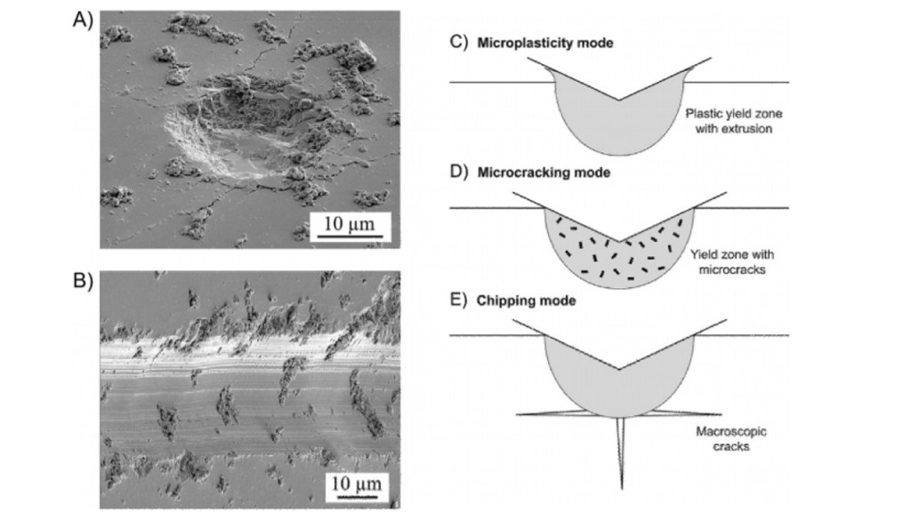 Figure 2: SEM imaging of the enamel surfaces of extracted human molars, display microwear signals which are illustrated in images A and B on the left (Constantino et al. 2015). Image A represents axial contacts, whereas Image B represents sliding contacts (Constantino et al. 2015). The debris indentations are characteristic of brittle materials grazing along its surface (Constantino et al. 2015). The images on the right are cross-sectional representations of wear modes beneath sharp indenters, with image C displaying mild plastic extrusion at the edges of contact, D as observed to be severe or abrasive microcracks within the yield zone, and finally E as the ultra-severe case, with macroscopic chipping cracks experienced at the yield zone (Constantino et al. 2015).