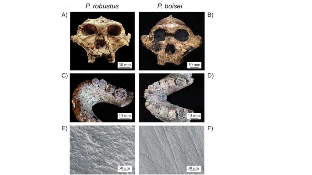 Figure 3: The naturally occurring dental wear and dentition of Paranthropus robustus and Paranthropus boisei (Constantino et al. 2015). Images A and B show the ectocranial crests of both species; images C and D show the tabular tooth wear in towards the dentin; and Images E and F data was collected through SEM imaging to reveal microwear damage (Constantino et al. 2015). This figure is used in this literature to show that despite the seemingly robust masticatory musculature of both species, microwear data analyses show dietary differences, therefore supporting the critique of solely using dental microwear and macrowear to make inferences on diet, as flawed (Constantino et al. 2015).