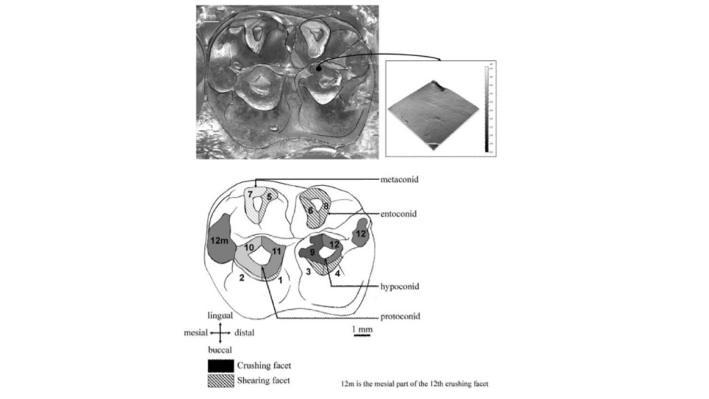 Contemporary dental microwear analysis study ante-mortem micro-features on tooth enamel, indicating diet, and caused by the abrasion of exogenous particles and food items (Belmaker 2018). The post-canine teeth molded with polyvinylsiloxane dental impression materials and after following in vivo molding protocols, the molds complexity is used to indicate the amount of changes reflected on the surface’s relief at different scales (Percher et al. 2017). Since 2003, dental microwear studies have used surface metrology quantification methods that include SSFA (scale-sensitive fractal analysis) and ISO 25178 (“the International Organization for Standardization collection of standards relating to the analysis of 3D areal surface texture”) (Belmaker 2018). The dental topography is used to track the morphology of the occlusal form, while the 3D point cloud from CT or laser scanning and GIS software, reveal variables such as cusp relief, slope and angularity (Belmaker 2018).